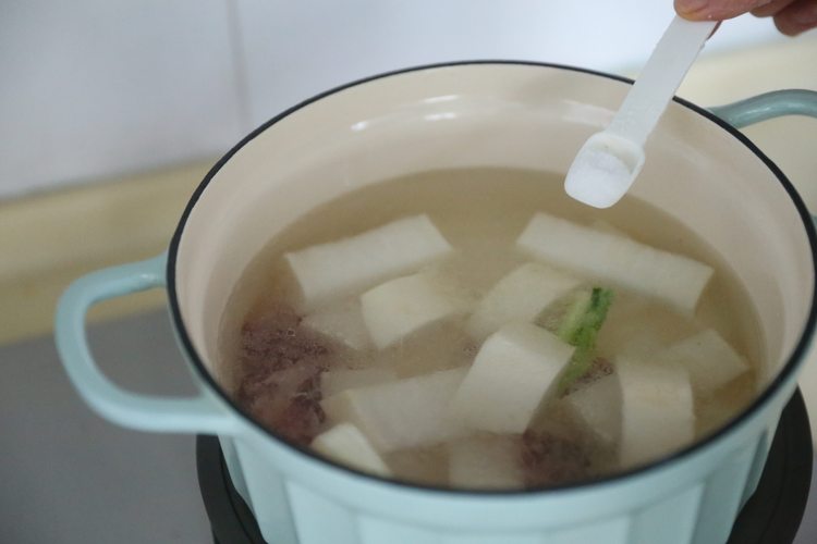 加入清水,萝卜,香肠和盐,盖上锅盖煮沸。