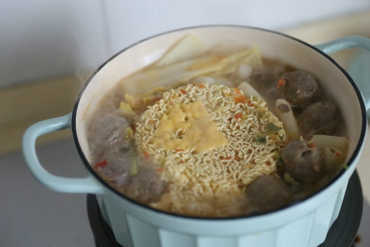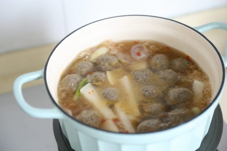 煮沸的汤里放入冷冻丸子和蒜蓉蚝油酱,盖上锅盖继续煮沸。