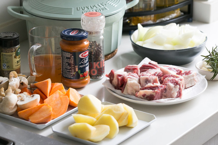 蘑菇对半切,土豆胡萝卜切滚刀块,洋葱切大块,因为要炖蛮久的,所以蔬菜不要切太小,也可以加点自己喜欢的别的蔬菜~牛腩切大块,用厨房纸擦干表面水分。烤箱预热160度~