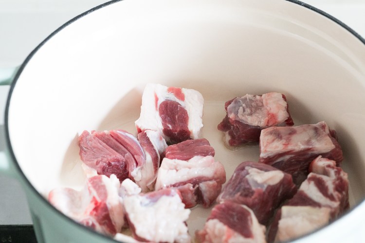 锅开小火,热锅之后倒入黄油或者橄榄油~放入牛腩煎至表面金黄(尤其是比较肥的地方多煎一会,让油出来多一些)。