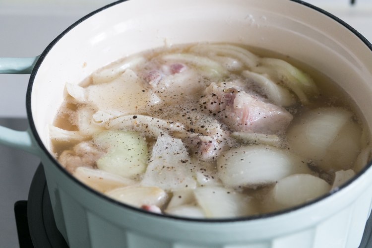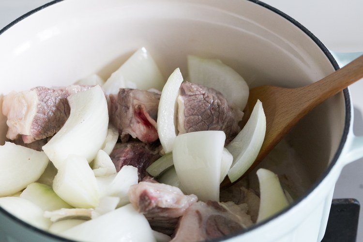 倒入红酒和水直至盖住牛腩,继续加入适量的盐和黑胡椒(根据自己的口味和平时做菜的习惯调整,因为汤挺多的,此处可以少加一点,等后面再调整)。