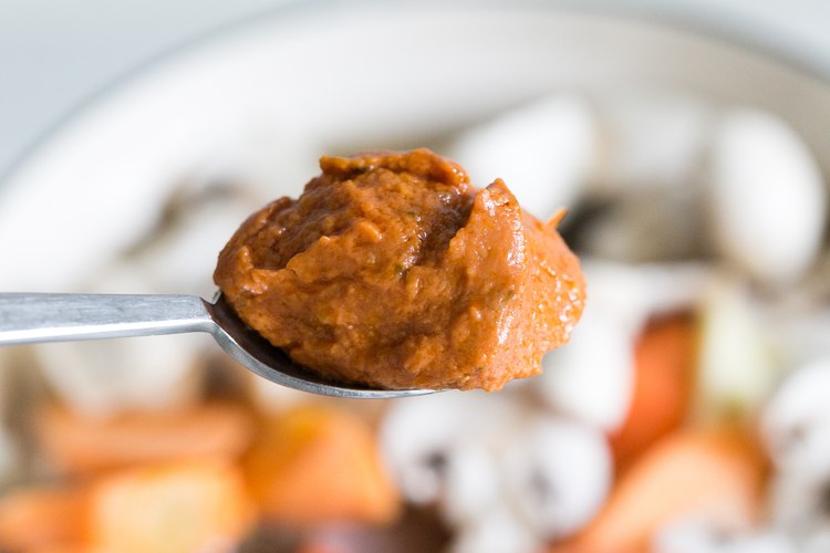 放入蘑菇、胡萝卜、土豆,再加入四勺番茄酱(番茄膏/番茄沙司均可)。