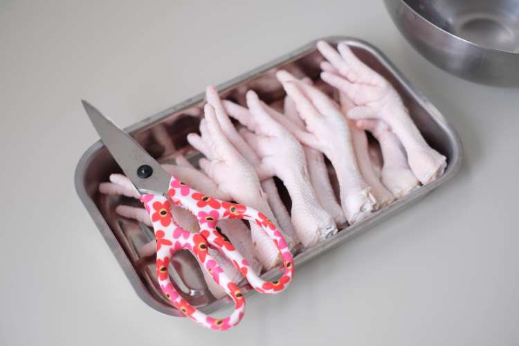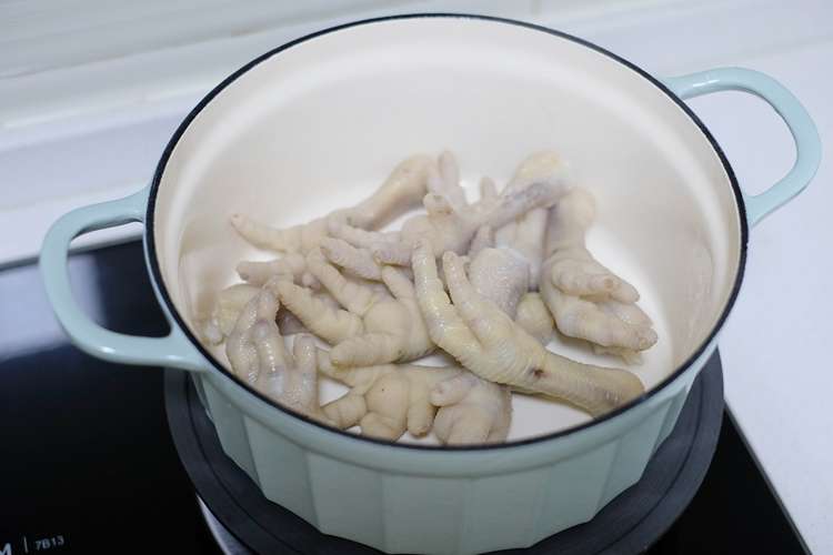 冷水下锅放入鸡爪煮开焯水,水开后煮到断生,温水冲洗干净。