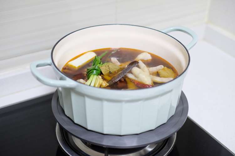 加入所有的调料香料,倒入开水,没过鸡爪。