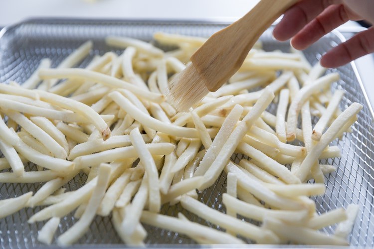 薯条直接倒在空气炸网或者烤盘里,用刷子给薯条薄薄涂上一层油。