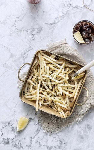 出炉后,趁热在薯条上均匀撒上细盐和海苔碎。按个人喜好可搭配番茄酱或者沙拉酱,但是原味就很好吃了。