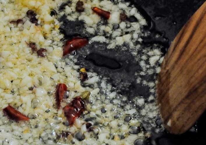 炒锅烧热,加入适量食用油,将花椒、蒜末、干辣椒炒出香味。