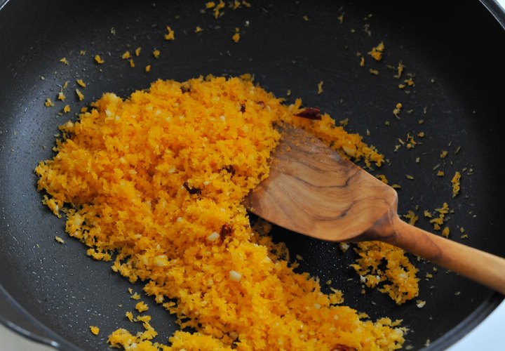 加入面包糠和1/2茶匙盐,翻炒均匀,关火备用。