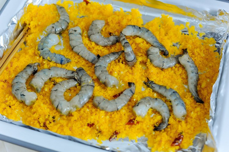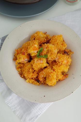 将炒好的面包糠倒入烤盘,腌渍好的虾仁放入翻拌,使虾仁均匀裹满面包糠。