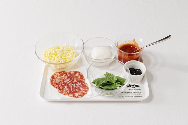 先在面饼的二分之一里铺满马苏里拉芝士碎,放上萨拉米香肠,再撒上少许的黑橄榄。