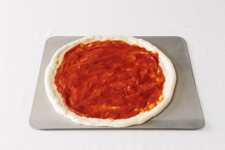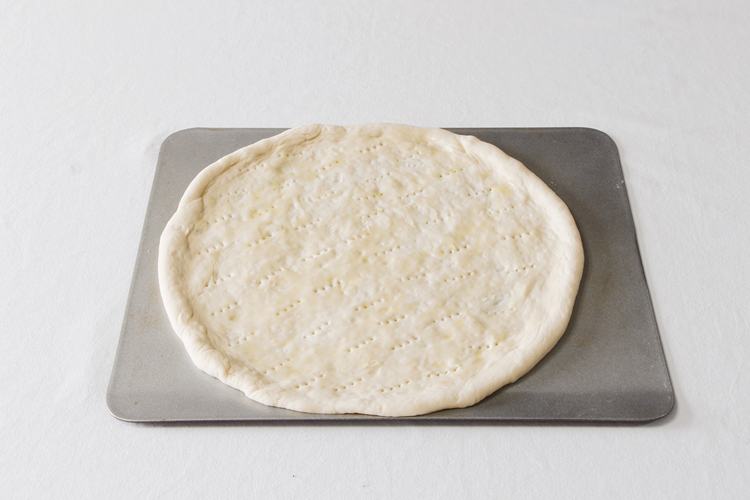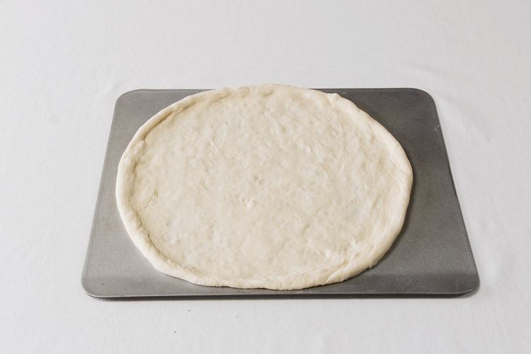 发酵好的面团取出排气揉圆,静置松弛10到15分钟。操作台上扑一层面粉防粘,然后把面团擀成一个直径约30cm的圆形面饼。在靠近边缘的地方用手掌或是拳头压出一圈较厚的边缘。