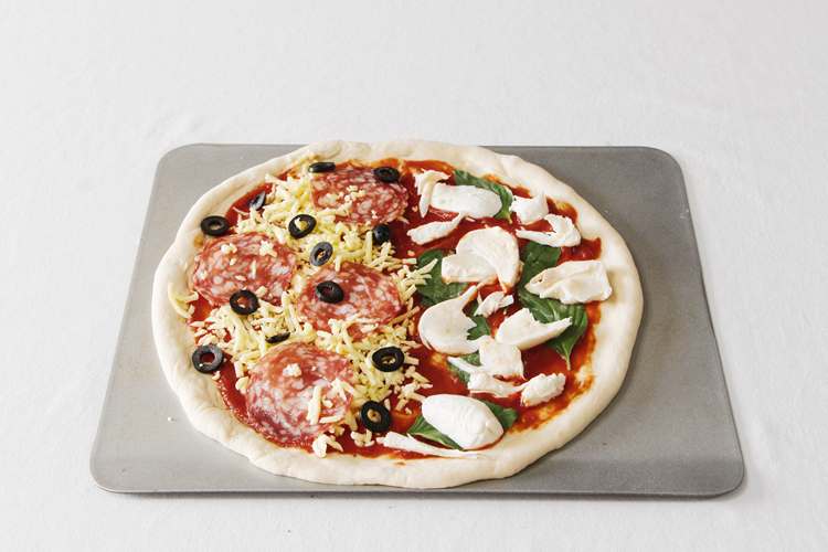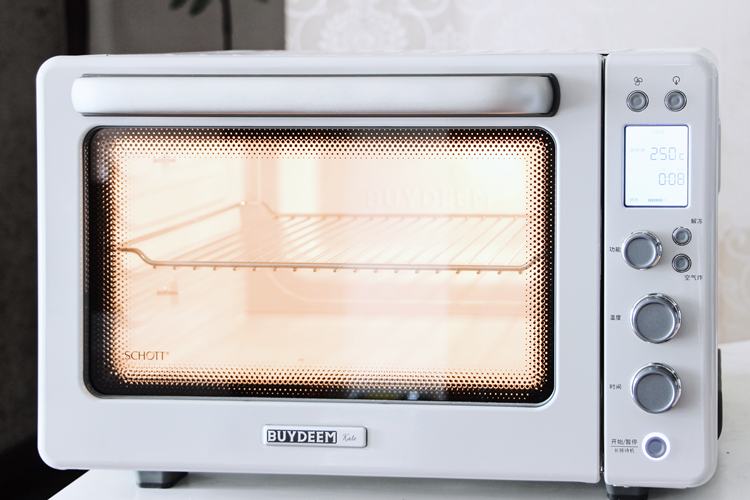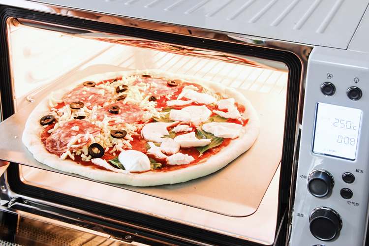 预热好后将披萨送入烤箱。250度的温度烤8到10分钟左右,具体时间可根据芝士融化程度来调整。