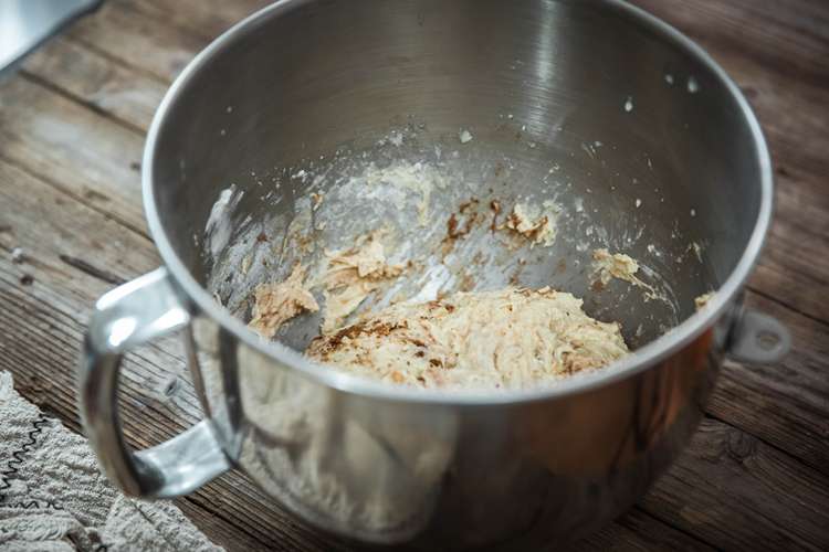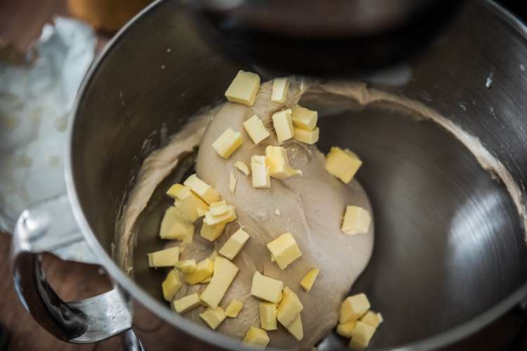 牛奶、白糖、酵母混合在一起,静置五分钟。在搅拌缸中加入面团所有的液体材料(牛奶糖酵母混合物,苹果酒,鸡蛋),搅拌均匀,再倒入高筋面粉、盐、肉桂粉搅拌均匀。
