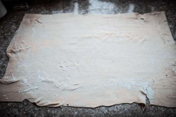 再把三块面团放在油纸上分别擀成长方形(大约60*40cm),放入冰箱冷藏50分钟。