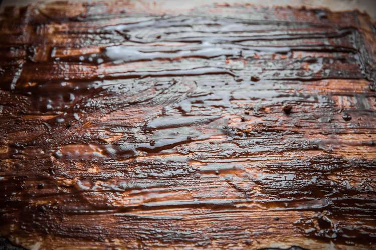 从冰箱取出长方形薄面团,涂抹上混合填充物,冬天涂得要快一点,不然很快就凝固了,凝固了的话可以放入微波炉打20秒使用。