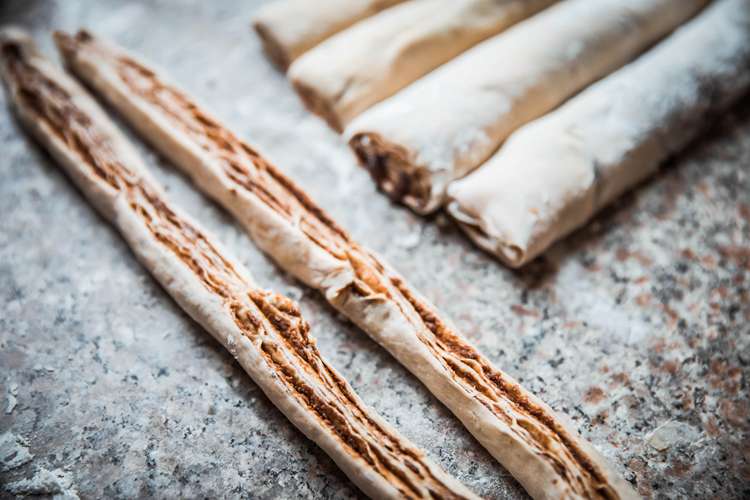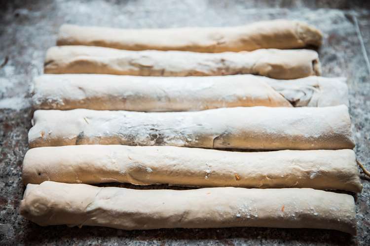 依次卷完所有面团,然后拦腰对半切开,变成六个长条面团。