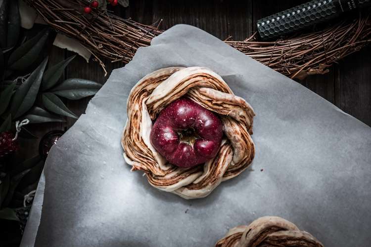 依次卷完所有的面团,然后把蛇果洗干净擦干水分,拦腰对半切开,切面向下,面团绕苹果的一半一圈用牙签收口。