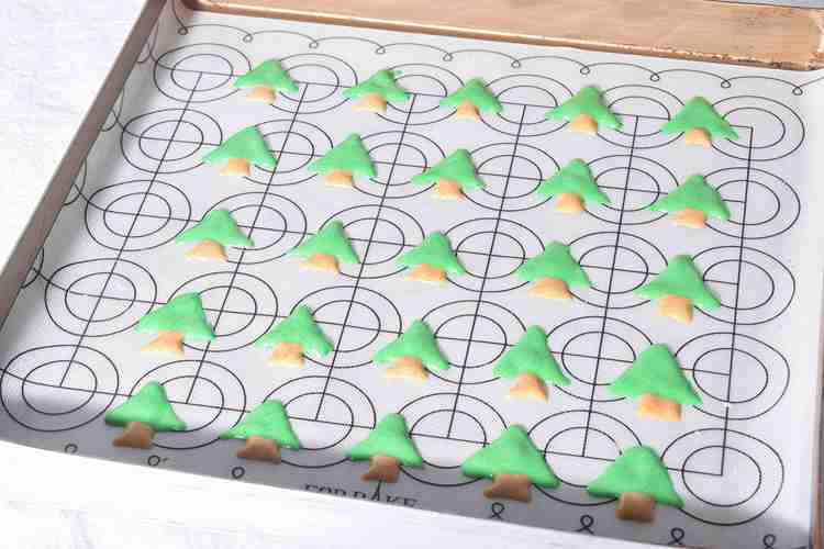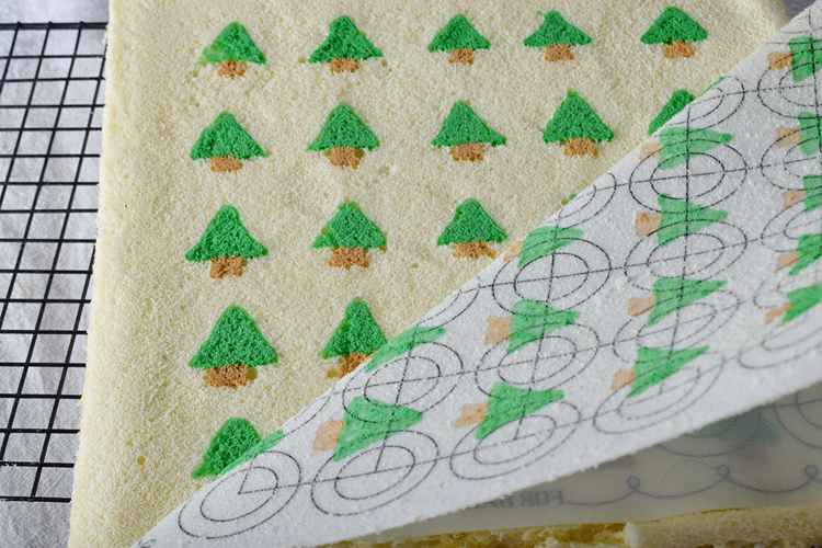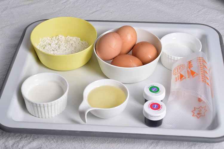 烤盘垫上油布或者硅胶垫,绿色面糊画出三角形,棕色画树干。