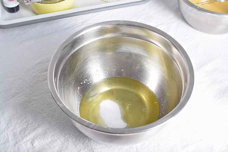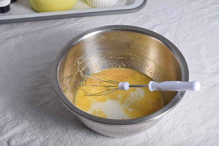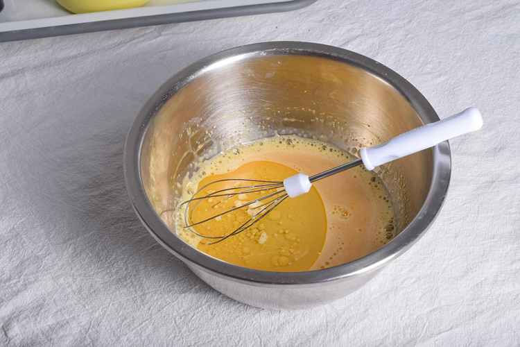 蛋黄打散加入玉米油,用手动打蛋器搅拌均匀。
