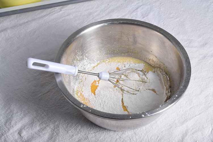 低粉和玉米淀粉混合,筛入蛋黄的盆里,用手动打蛋器拌匀,切记不要划圈圈搅拌。