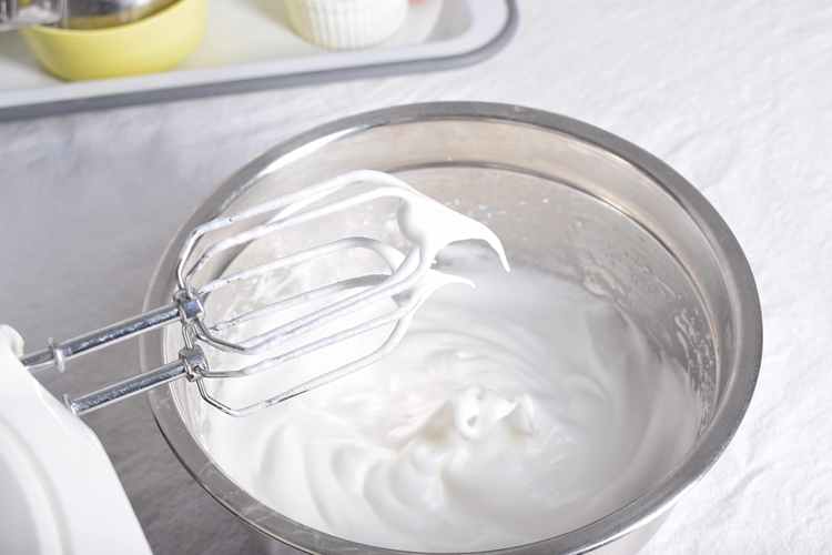 蛋白一定用电动打蛋器打发,分三次加入细砂糖,蛋白只需要打发到图片里有小弯钩的状态就可以了。