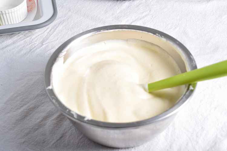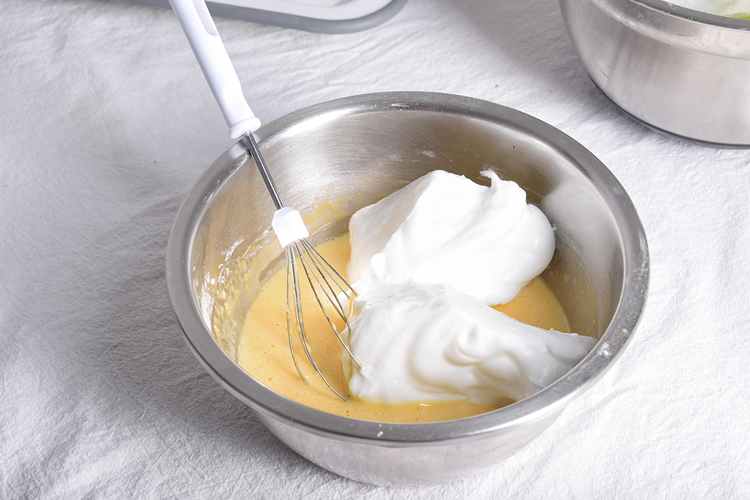先挖出三分之一的蛋白与蛋黄糊混合均匀。