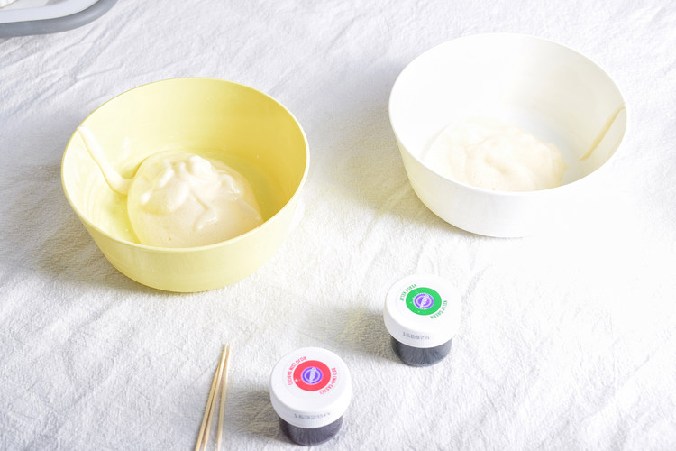 称出一份10克面糊,一份5克面糊,用牙签分别蘸取色素与面糊混合均匀,放到裱花袋里,封口系紧,下端剪小口。