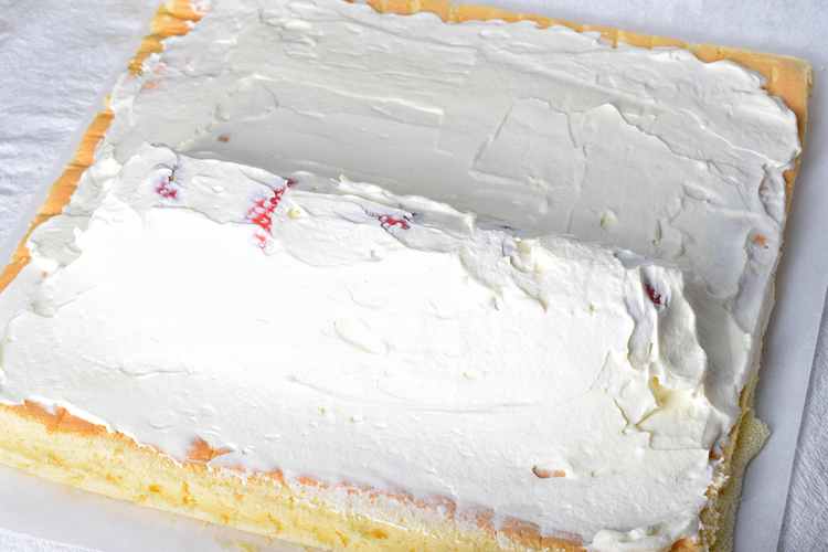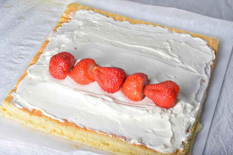 铺一张油纸,晾好的蛋糕卷倒过来放在上面,把打好的淡奶油抹在蛋糕卷上;放上草莓。