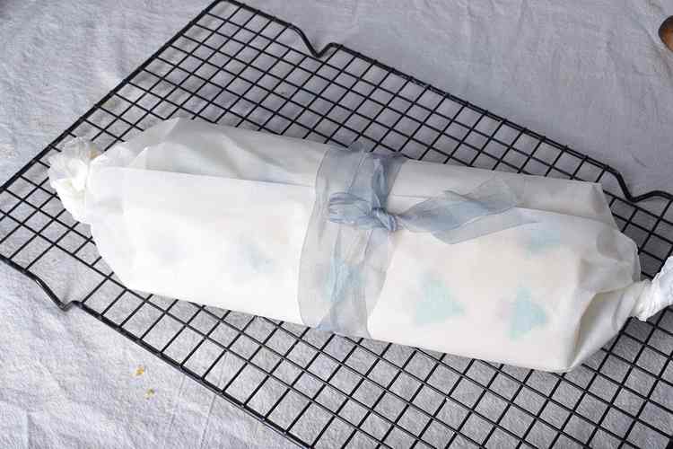 卷起蛋糕卷,卷太肥了,油纸包不严了都,所以用丝带固定的。冰箱冷藏四个小时以上。