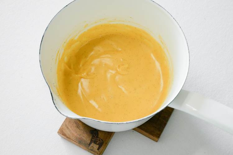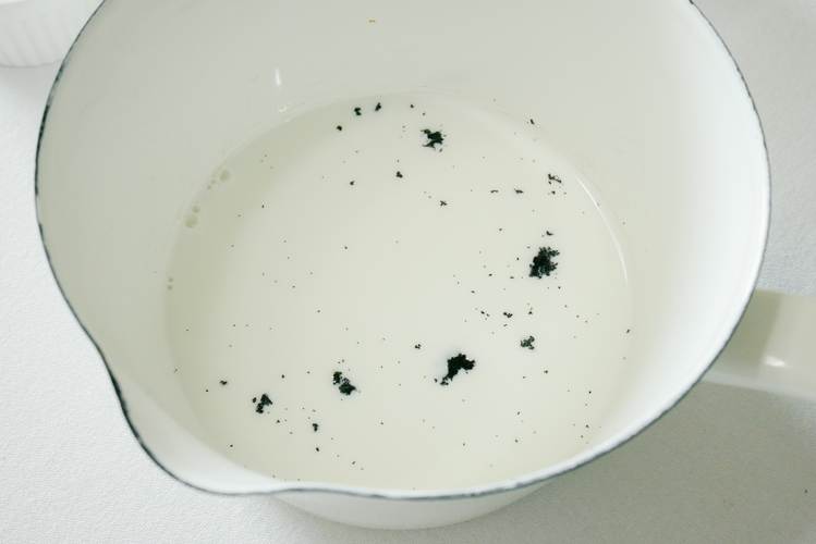 牛奶倒入小奶锅中,加入香草籽,用小火慢慢加热至牛奶沸腾。