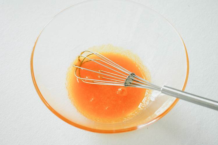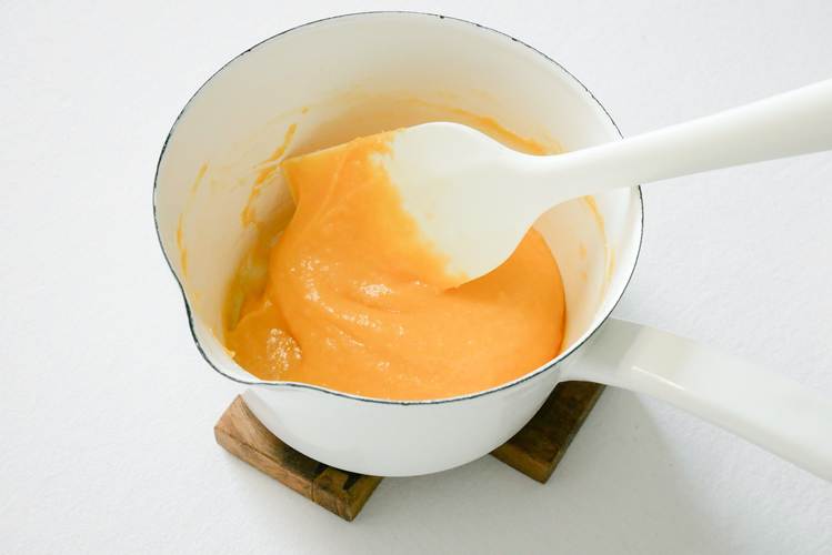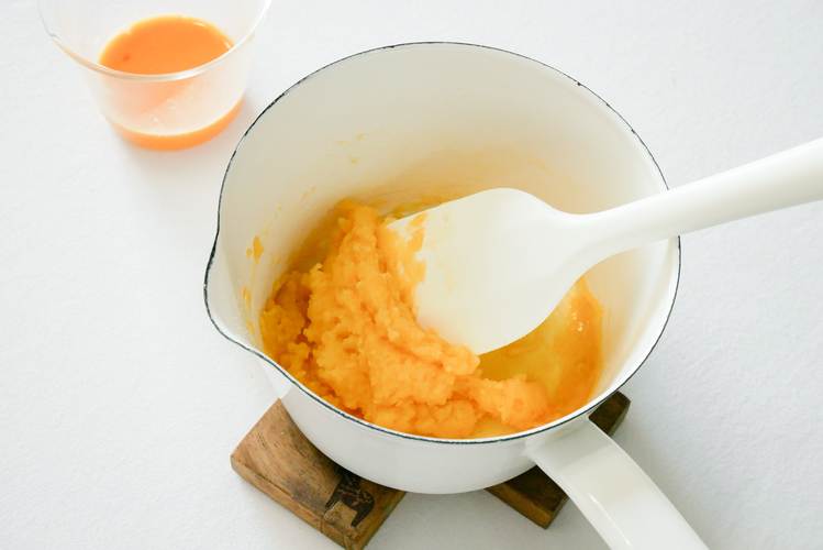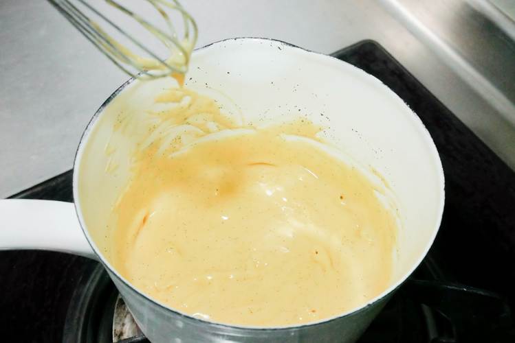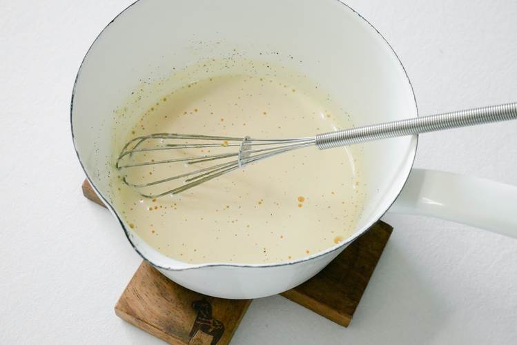 开小火加热小锅中的蛋奶液,加热过程中蛋奶液随着温度的上升会变得浓稠,所以要一边用蛋抽不断地搅拌边加热。