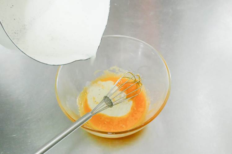 煮好的牛奶取一半缓慢地倒入蛋黄糊中,边倒边搅拌,防止结块。