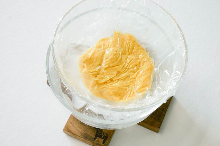可让装卡仕达酱的容器坐入冰水中再放入冰箱冷藏。冷藏前需用保鲜膜紧紧地覆盖表面。