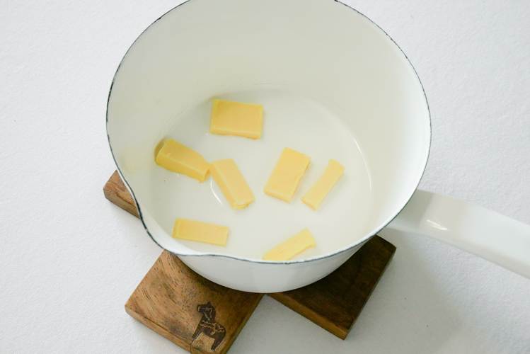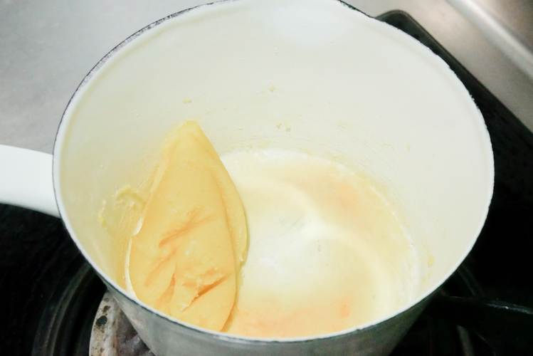 无盐黄油切成小块儿,和牛奶再加上一小撮的盐放入锅中用小火加热。