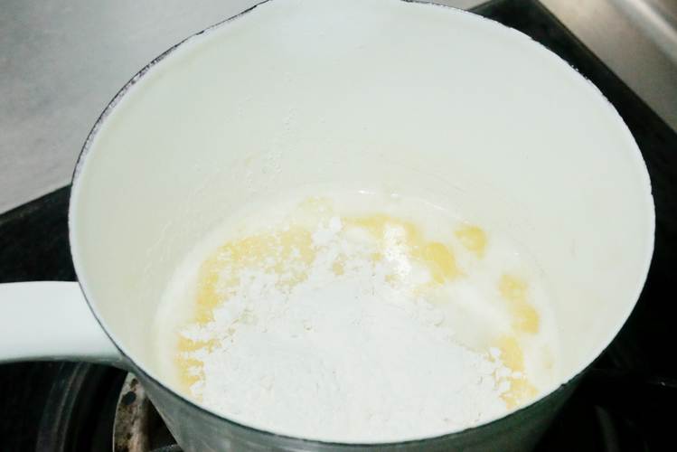 黄油融化后再继续加热到充分沸腾的状态时关火,把锅子从炉灶上移开后一股气倒入的低筋面粉,用刮刀迅速地奋力地搅拌。