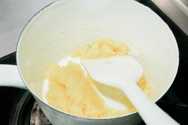 继续开小火加热,一边用刮刀翻拌一边加热,直到水分蒸发锅底形成了一层薄膜。关火,面糊糊化就完成了。