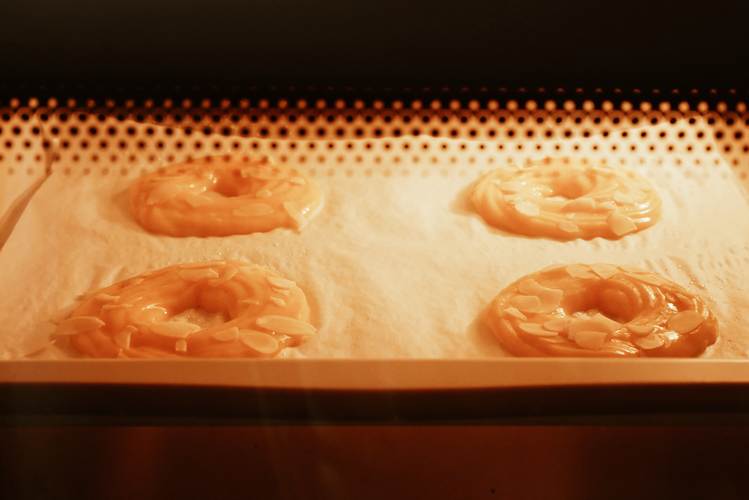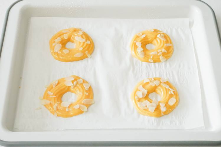 将制作好的泡芙面糊倒入装好裱花嘴的裱花袋中,挤出两圈环形面糊。喷上少许水,撒上适量杏仁片。