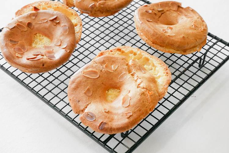 出炉后的泡芙摊凉,然后用锯齿刀横着将泡芙一分为二。