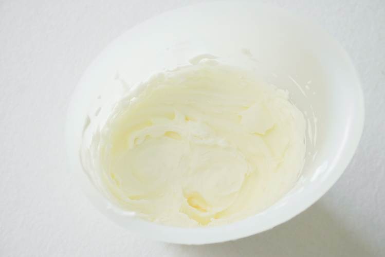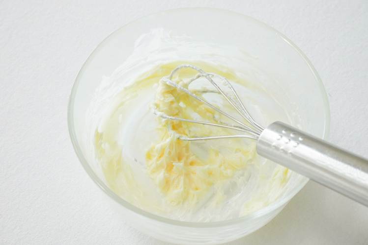 卡仕达酱材料中的30g黄油放置室温软化,用蛋抽搅打均匀。
