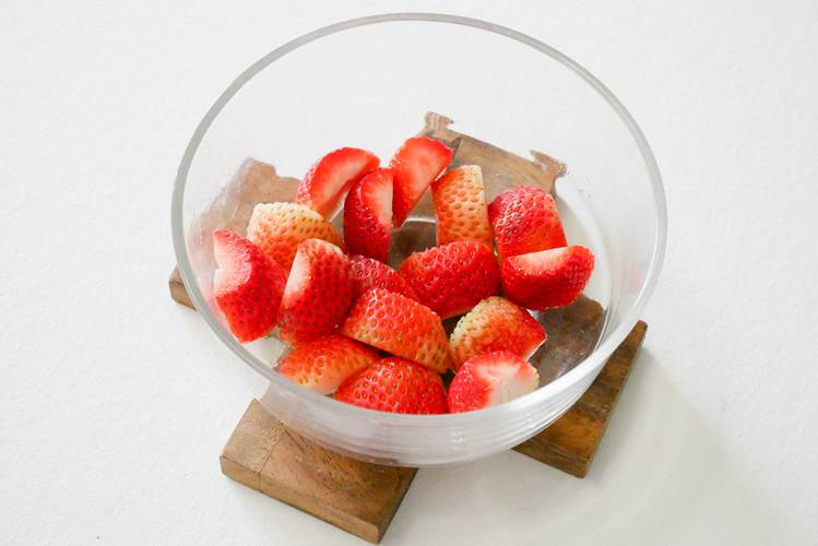 开始组装:将草莓洗净去蒂,头尾都适当切掉一点,切成高度大小基本相同的小块。
