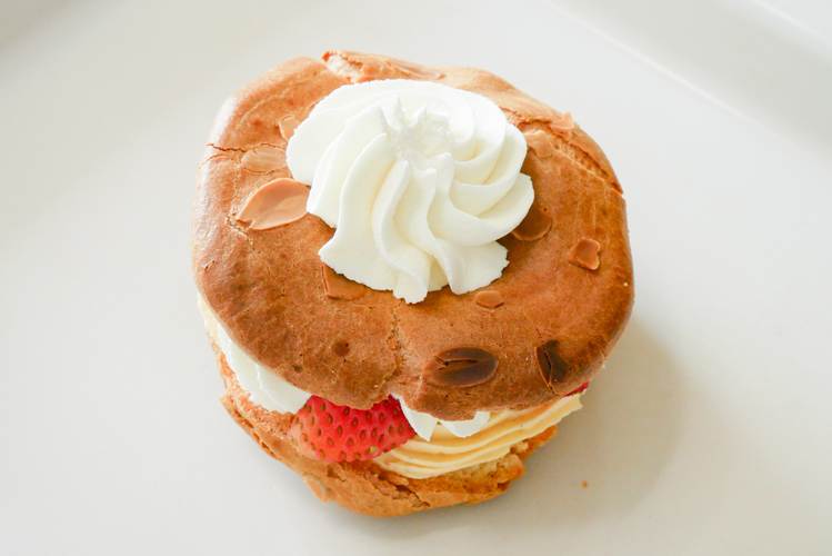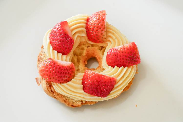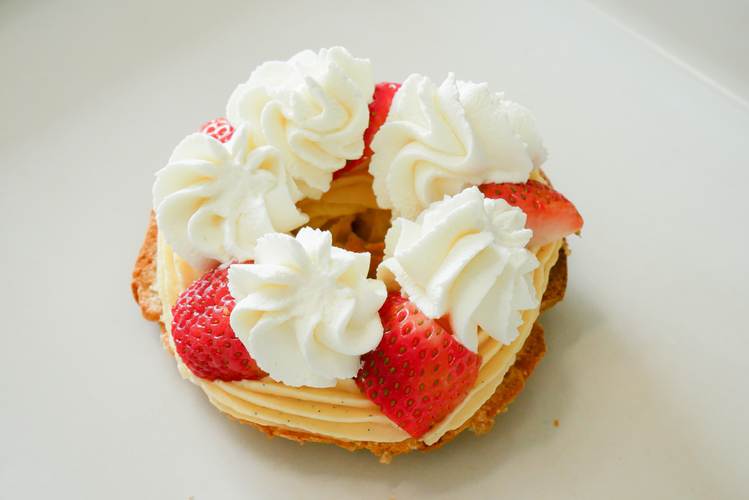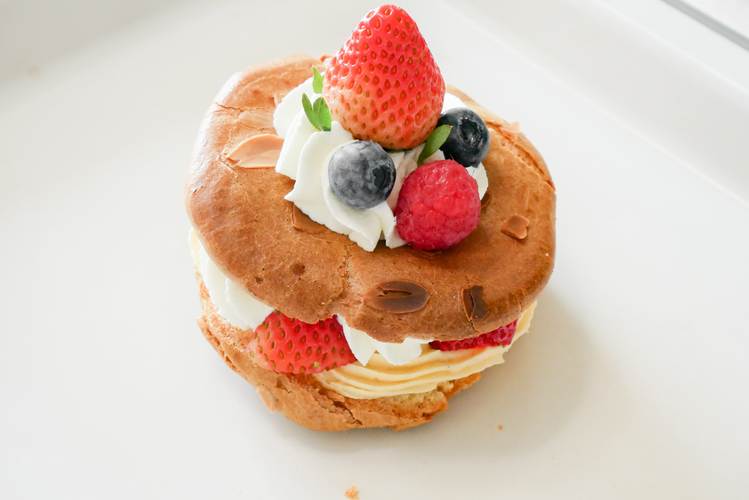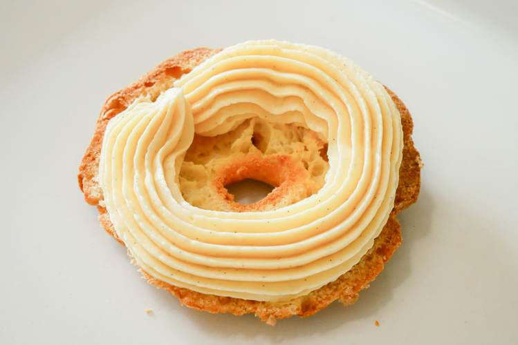 切开的泡芙取下半部分当底座。将卡仕达酱挤一圈在泡芙底座上面。