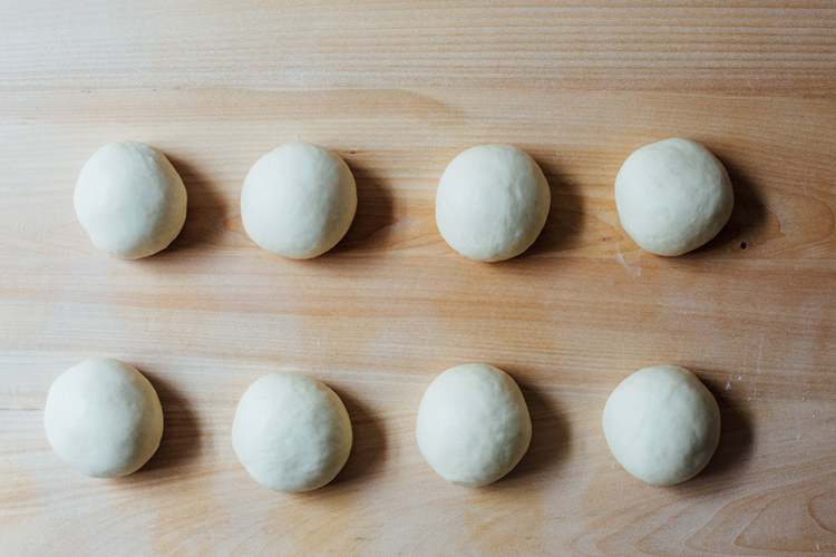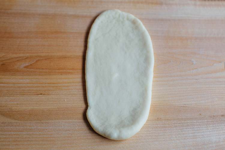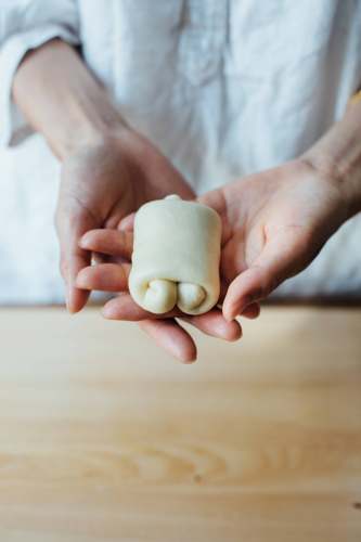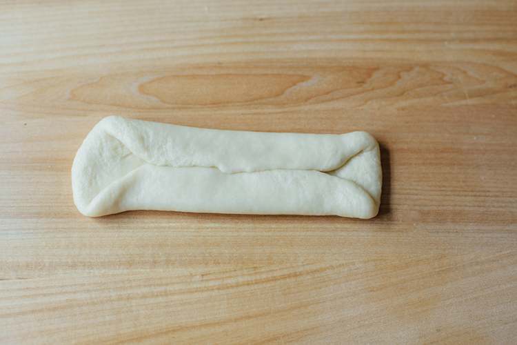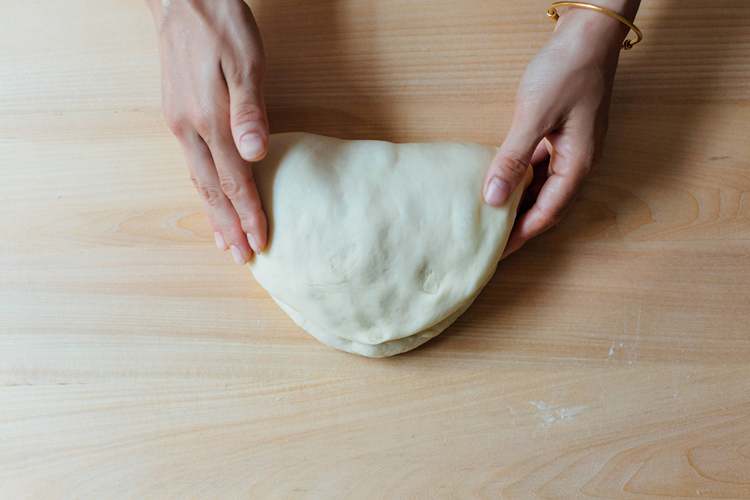 从发酵盆里取出面团,轻轻拍打,排气,折叠。