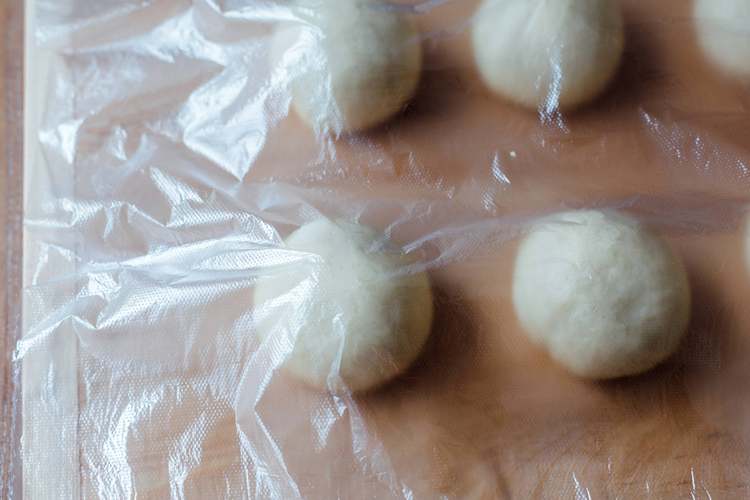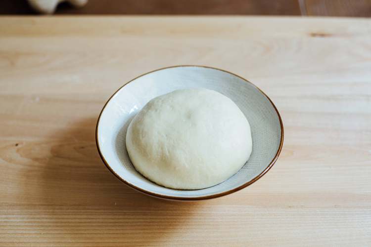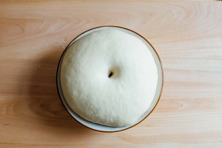 把面团取出,放盘里盖保鲜膜发酵,夏天35-40分钟,冬天一小时。面团发酵完毕,此时的状态是用手指戳一个洞,面团不回缩。