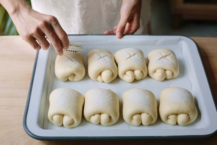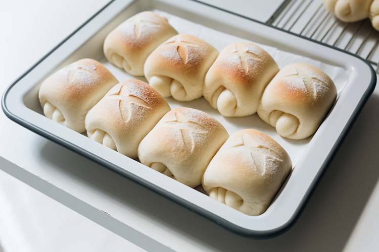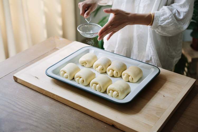 预热烤箱。用筛子筛一层薄薄的面粉在面包上。面包割两道口子。