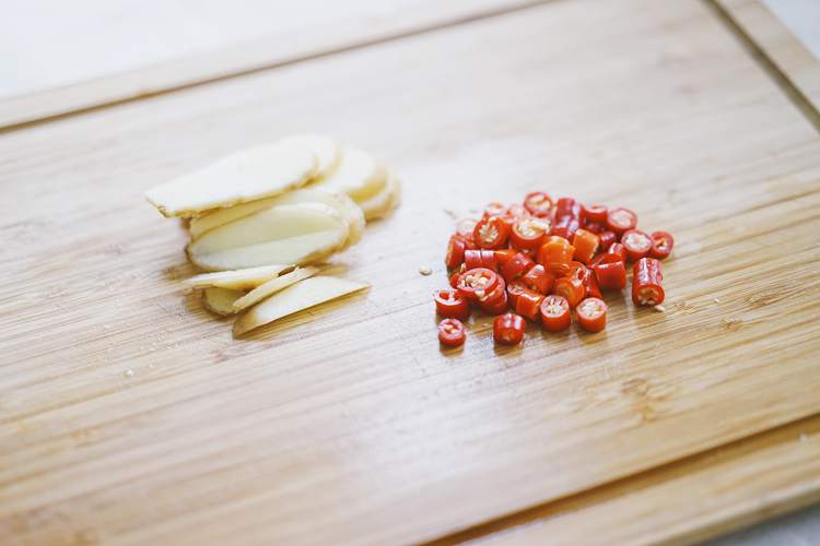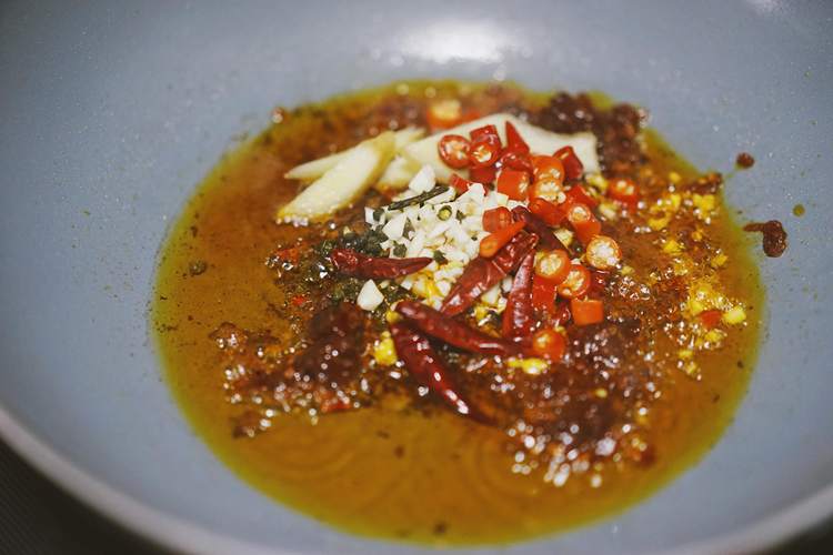 将小米椒、仔姜、蒜蓉、干辣椒、青麻椒倒入锅内翻炒,加适量热水,用盐和生抽调味。
