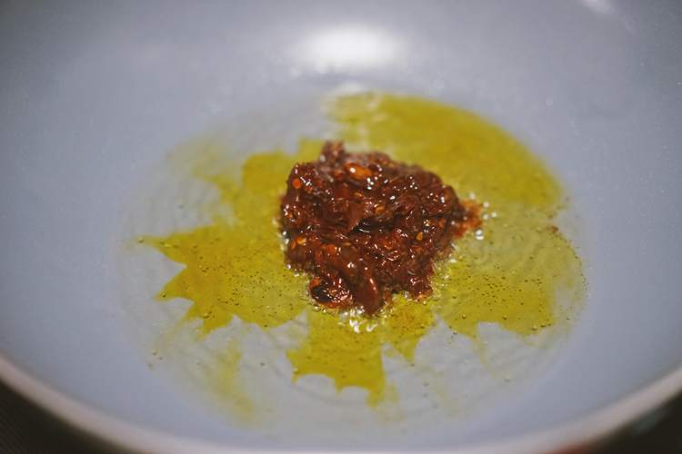 锅内倒入食用油烧热,放入郫县豆瓣酱炒出红油。