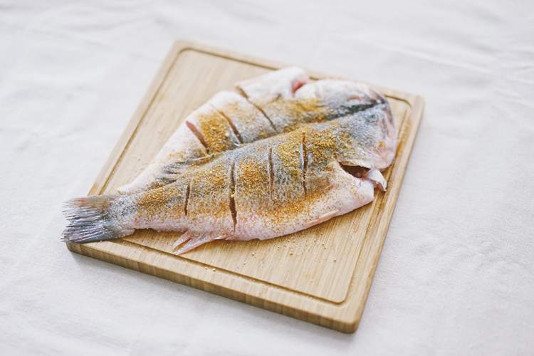鱼身从中间剖开,注意不要切断,在表面划几个口,撒上盐、辣椒粉、生姜粉和料酒涂抹均匀,腌制1小时。