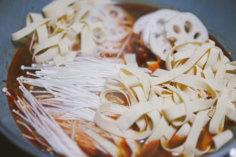 莲藕、金针菇、千张丝入锅煮8成熟。