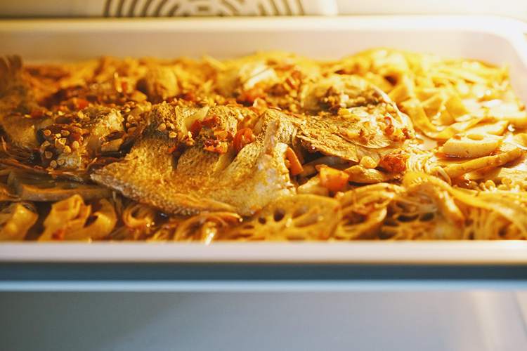 鱼腌好后放在烤盘上,入烤箱200度,20分钟。