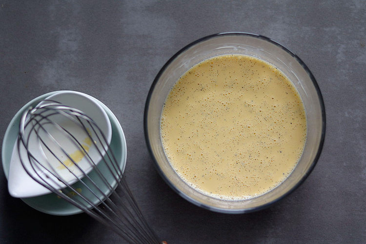 把蛋挞液里的所有材料倒入一个大碗内,再剖一小根香草籽加入进去,用手动打蛋器打均匀。